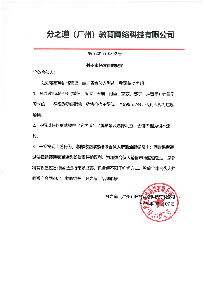 一经发现上述行为,总部将立即冻结该合伙人所购全部学习卡;同时保留通过法律途径追究其违约赔偿责任的权利。为加强合伙人销售市场监督管理,总部将有权通过各种途径进行市场监察,包含但不限于钓鱼方式。希望全体合伙人共同遵守合同约定,共同维护“分之道”品牌形象。