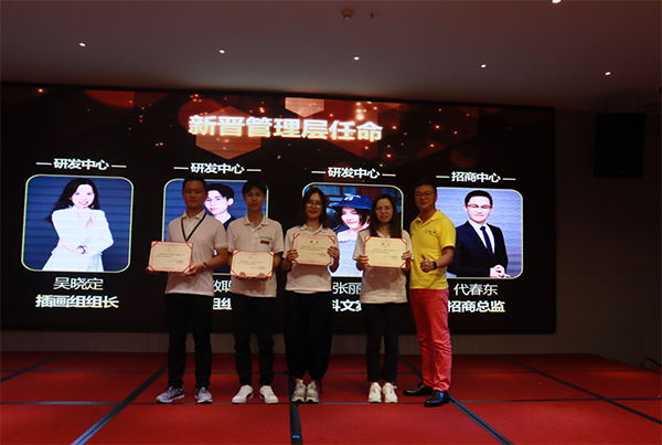 大会第三项:“新晋管理层任职仪式”。本次大会共任职四位新晋管理层,分别是插画组组长吴晓定、动画组组长欧敏聪、文科文案组长张丽敏以及招商总监代春东,他们都是极其优秀的管理层人才,势必能够为分之道研发中心与招商中心的发展带来巨大的贡献。