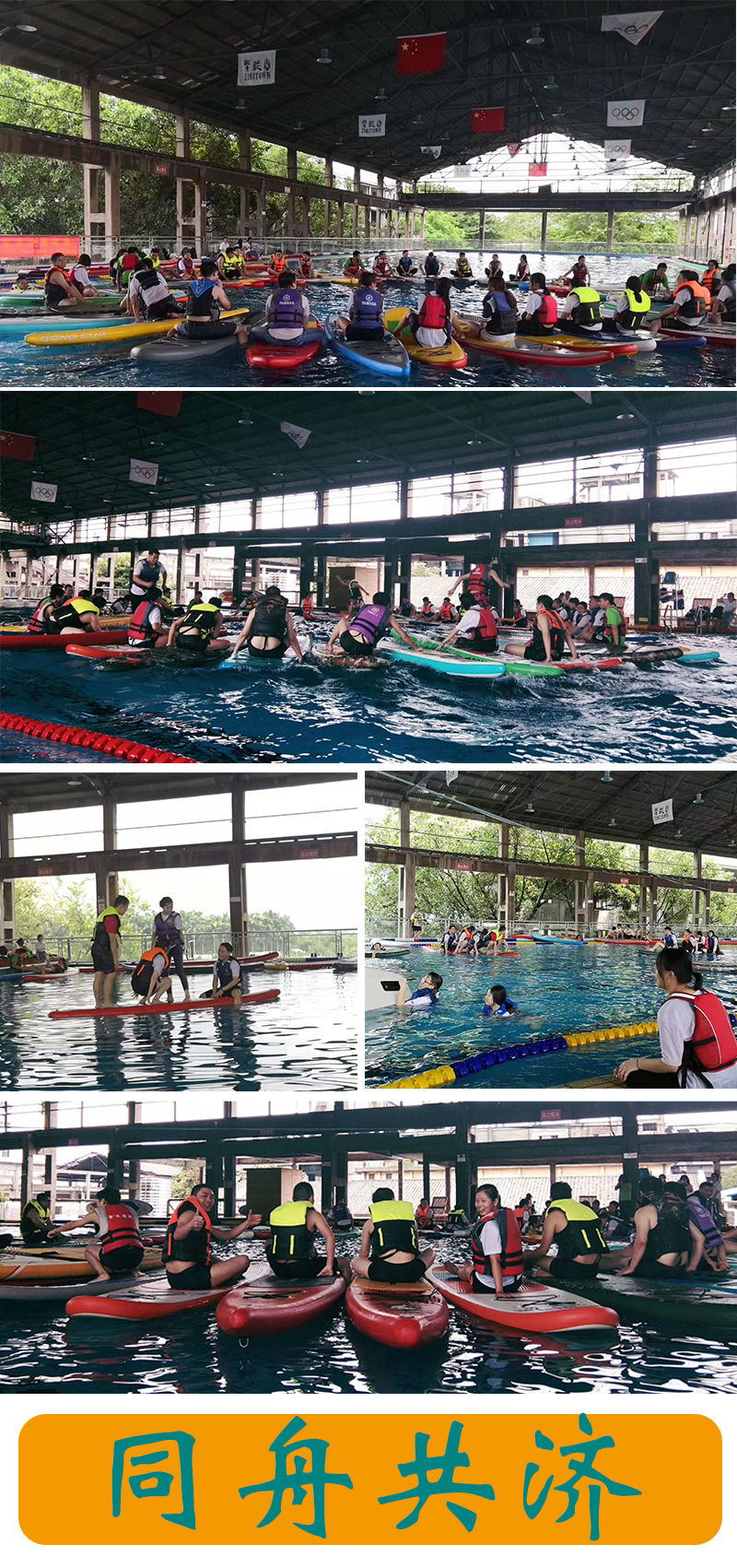 14:00,吃过午饭后,我们来到了下一个拓展基地——紫泥堂游泳馆。呀?大家来游泳吗?嘻嘻~这可猜错了哦。我们来这里进行的是一项水上(桨板)运动——风生水起·一桨成名 。