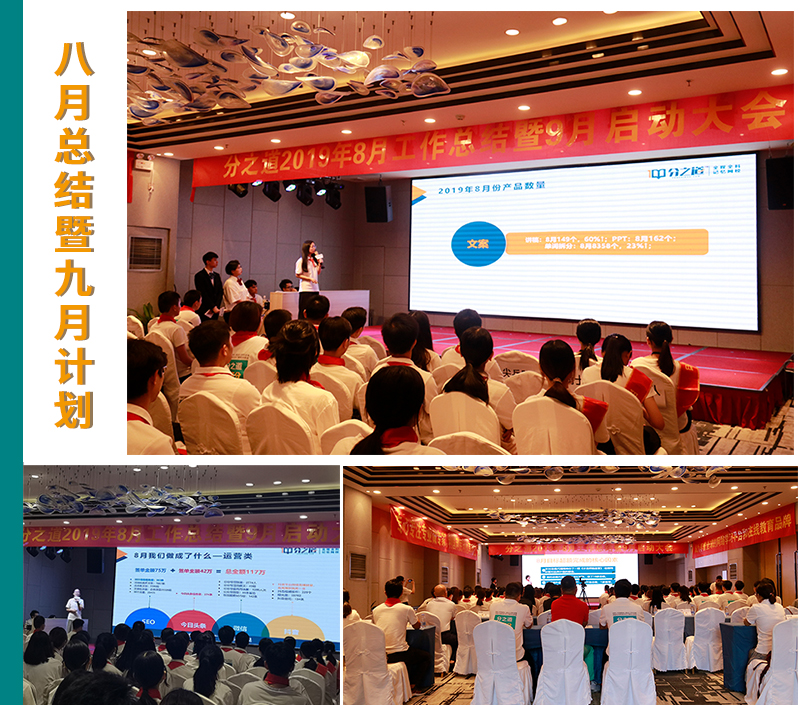 大会首先进行的是部门工作汇报环节:为公司发展保驾护航的招商中心、满足代理商各种需求的网络中心、不断超出用户期望,做出让客户尖叫产品的研发中心、时刻提供后勤保障的行政中心代表分别跟大家总结并分享了8月份工作所取得的成果,并根据实际情况,部署好各部门下一阶段重点工作任务和目标。