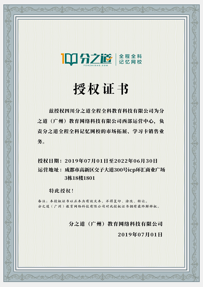 ——分之道授权证书——