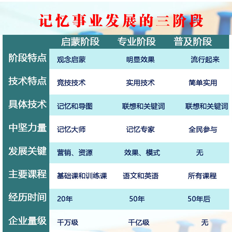 记忆培训,是一个新兴的朝阳行业,它以记忆技术和思维技术为核心,帮助社会大众(尤其是中小学生)提升记忆力、提升学习效率,是一项前途光明的事业!中国记忆事业的发展,需要经历启蒙、专业、普及这三个阶段。